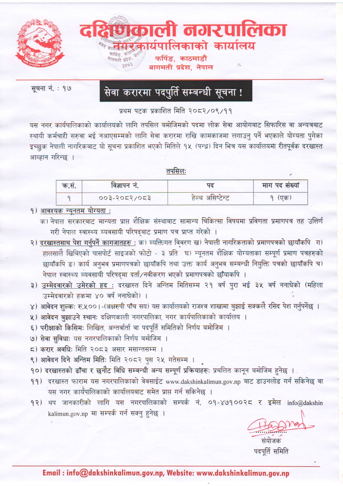 सेवा करारमा (हेल्थ असिस्टेन्ट) पदपूर्ति सम्बन्धी सूचना !