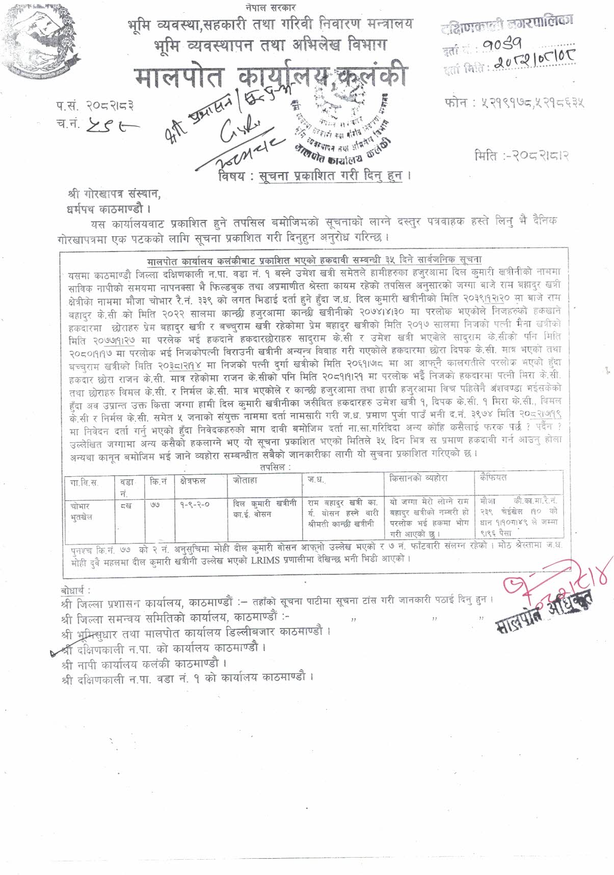 मालपोत कार्यालय कलंकीबाट प्रकाशित भएको हकदावी सम्बन्धी ३५ दिने सार्वजनिक सूचना !