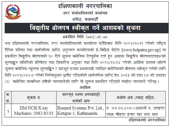 विद्युतिय बोलपत्र स्वीकृत गर्ने आशयको सूचना ।
