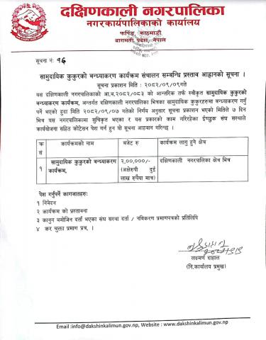 सामुदायिक कुकुरको वन्ध्याकरण कार्यक्रम संचालन सम्बन्धी प्रस्ताव आह्वानको सूचना !