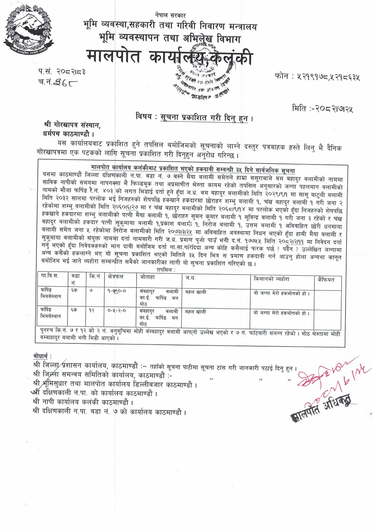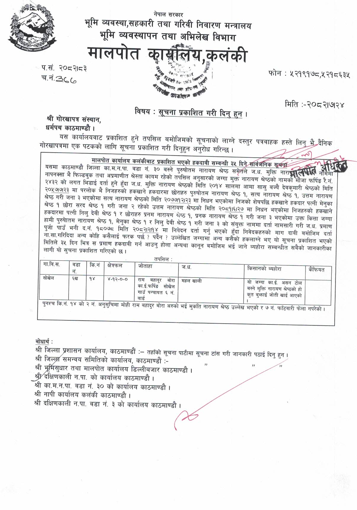 मालपोत कार्यालय कलंकीबाट प्रकाशित भएको हकदावी सम्बन्धी ३५ दिने सार्वजनिक सूचना !