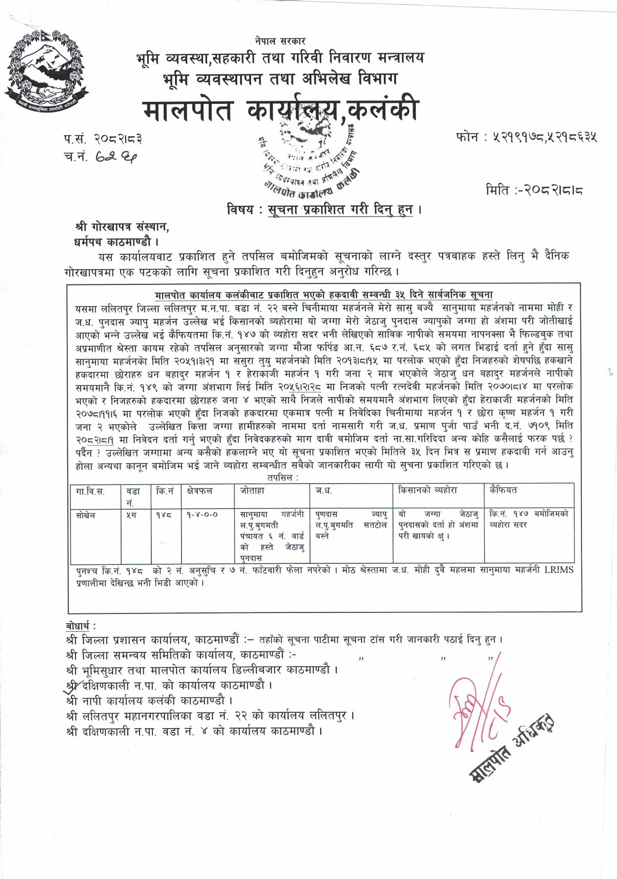 » मालपोत कार्यालय कलंकीबाट प्रकाशित भएको हकदावी सम्बन्धी ३५ दिने सार्वजनिक सूचना !